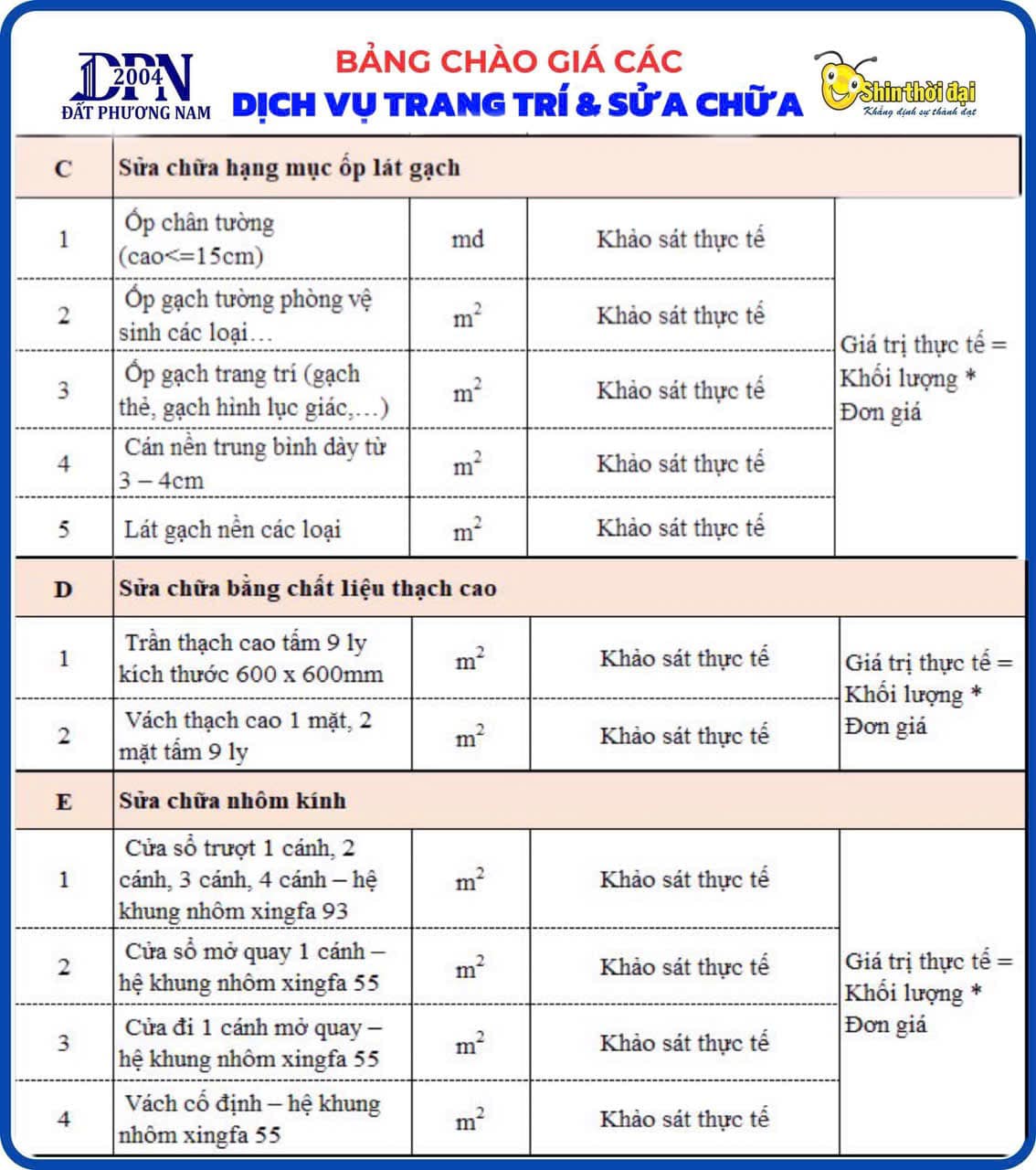 Bên cạnh dịch vụ trang trí, Đất Phương Nam cũng cung cấp dịch vụ sửa chữa cho các công trình đang xuống cấp. Các hạng mục sửa chữa sẽ được thực hiện bởi đội ngũ thợ lành nghề, đảm bảo an toàn và chất lượng cho công trình.